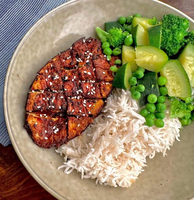 I just love the creaminess of egg plant with a slow roast in the oven. Somehow it feels buttery and velvety that no other veg can deliver . This was absolutely delicious and pretty simple. You just cut your eggplant in half and mix up a marinade and push it into those cuts so it goes all the way through. This would also be yum on the BBQ and I think a few carnivores may just love it too!