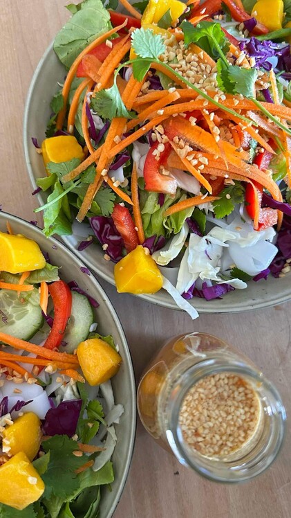 This has peanuts in it but of course if you don’t like peanuts or have a peanut allergy switch it out for cashew butter. If you can’t have any nuts then tahini would be my next choice. You can defiantly swap out the veg as I often do. Nobody needs an extra trip to the supermarket just go with what you have. Think colours and texture. I love frozen mango but I could easily leave it out or use a crisp pear or strawberries .