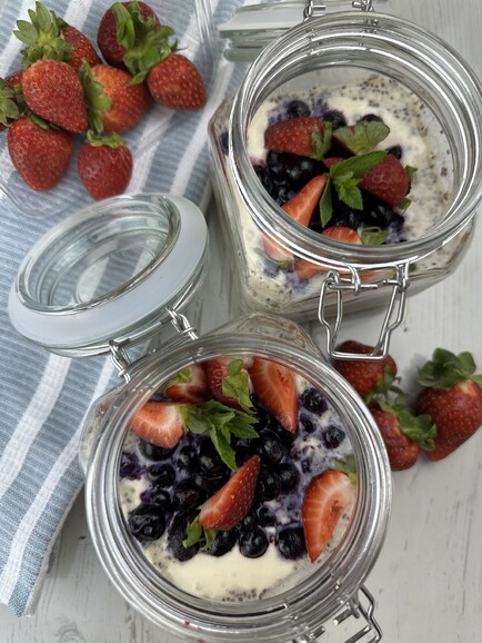So maybe instead of buying that box of cereal that’s loaded with sugar and oil you could reach for a tub of blueberries or some frozen blueberries. I like mine on top of my overnight oats. You can make a huge batch of these brekkie oats and spoon onto your plate in the morning. Nice and easy just how our mornings should be.