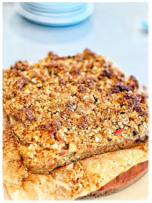 water to form a loose dough. Crumble the mixture over the top of the oatmeal mixture.