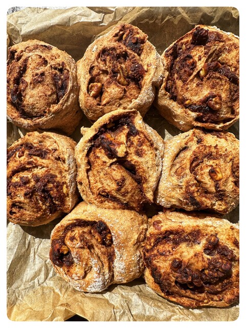 Spread the filling over the dough. Add extra walnuts and roll lengthwise nice and tight. I cut into 8 buns .