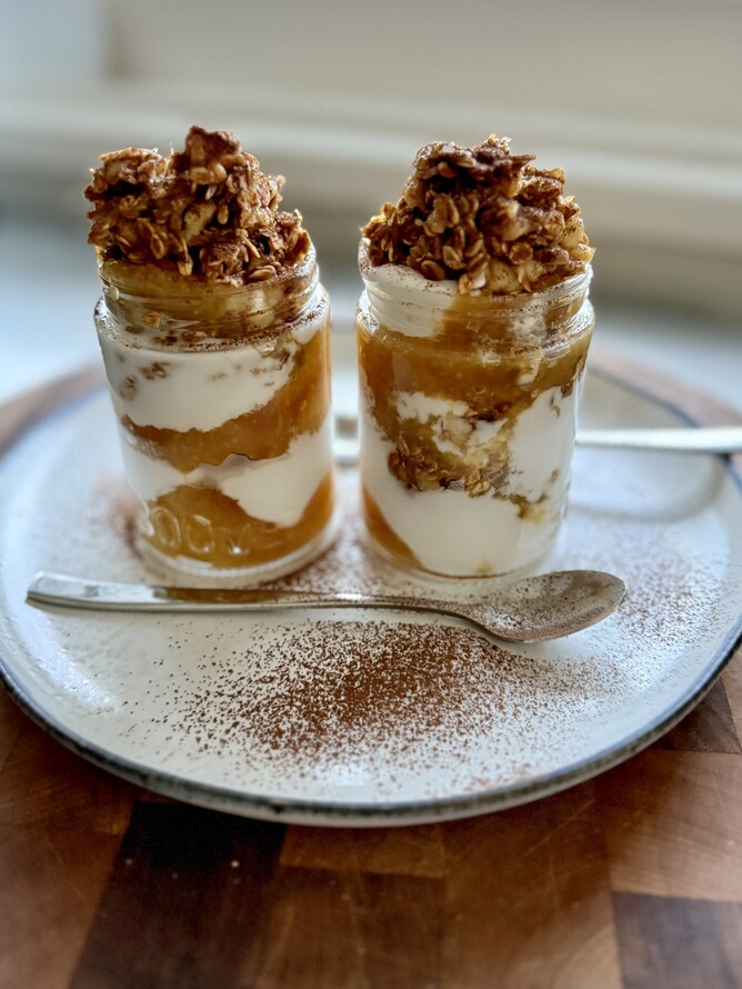 Stewed apple, layered with coconut yoghurt and quick caramelised in the pan Oaty crumble .