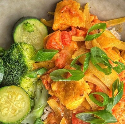 Sauté your onions till soft and add garlic and ginger . Next add your spices. Next add your tomatoes and coconut milk. Simmer for 8 - 10 mins till flavours have combined and it’s hot . Add in your tofu .