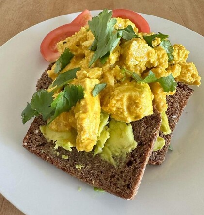 Now in your frypan crumble in a block of firm organic tofu ( drain off water). This should be the size of your “egg curds”. Give them a little fry , use a little olive oil if you have oil or just add the “sauce “ mix straight on in to the pan . Heat until it’s all nice and warm . Now add your black salt - just a few grinds should be plenty . It’s pretty stinky like real eggs!