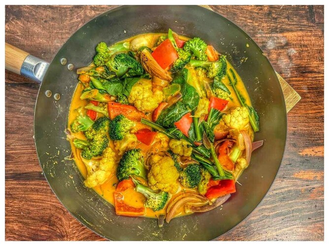 In a little water stir fry your onion until soft . Add your veg and your curry mix. I like to put a lid over my pan so they steam up nice and quick . Takes only 3-5 mins . Add in your milk . Heat through and you are done . Of course you could add chickpeas , or tofu or just as it is! We had ours with brown basmati rice to soak up all that golden goodness.